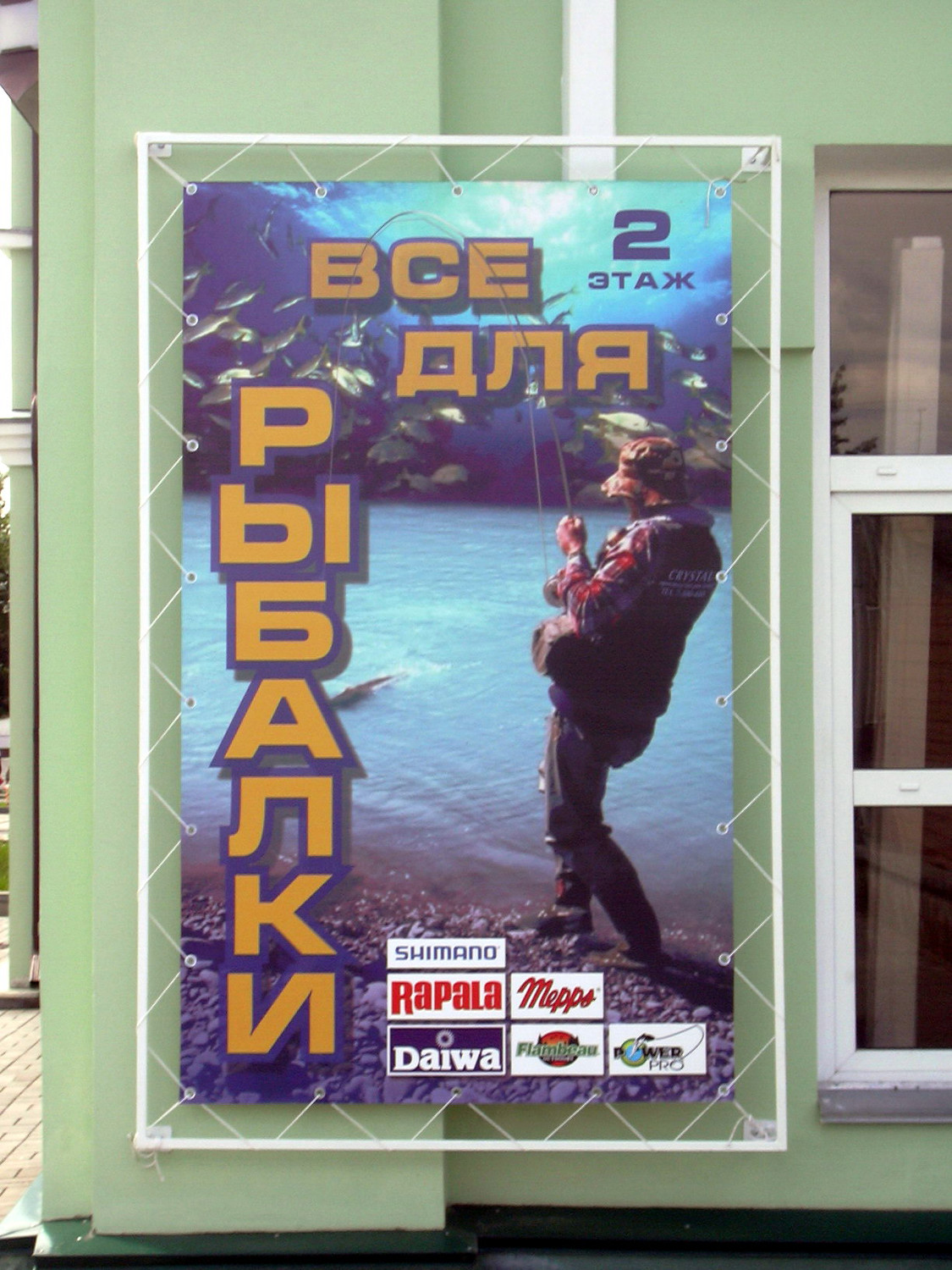 Рекламный баннер на металлическом каркасе. Расположен на фасаде ТЦ "На Моховом"